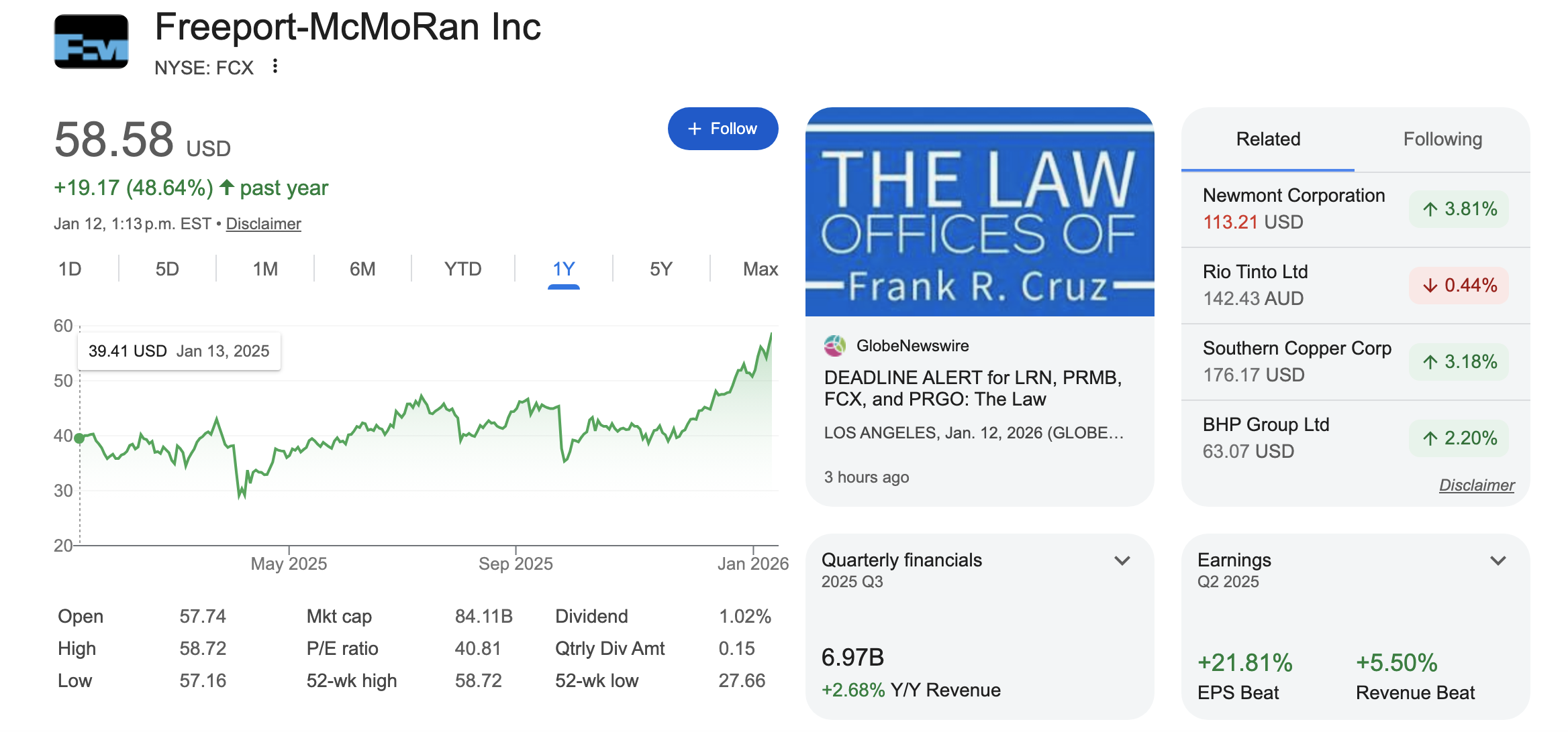 프리포트 맥모란은 인도네시아와 아메리카 대륙에 거대 광산을 보유한 세계 최대의 상장 구리 생산 기업입니다. 주가가 구리 현물 가격과 매우 밀접하게 연동되기 때문에, 구리 가격 상승의 수혜를 가장 직접적으로 받는 '구리 대장주'라고 볼 수 있습니다. 구리 외에도 금과 몰리브덴을 생산하며 수익 구조를 다변화하고 있죠.